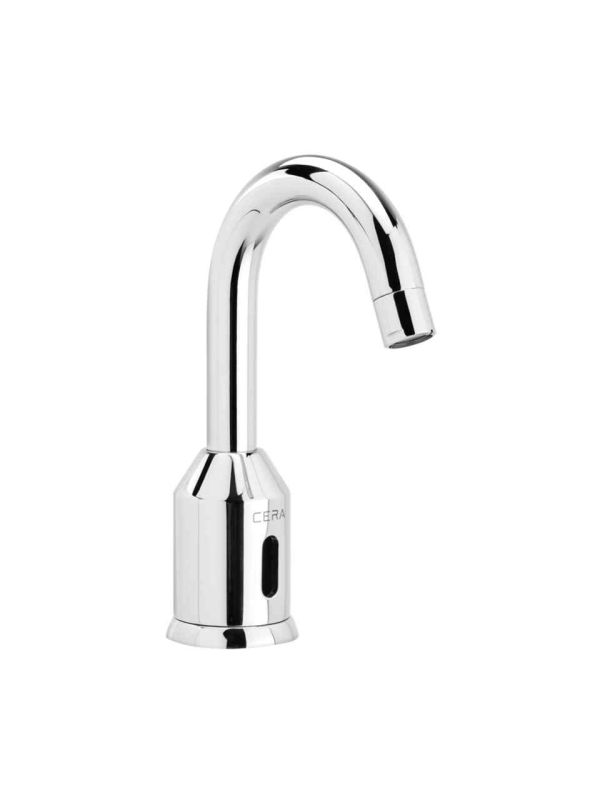 Brand: Cera Product Name: Deck Mounted Sensor Tap for Tabletop Washbasins with Tap Hole Item Code: F6010101 Material: Brass Color: Chrome Griha Council: Green Product Touch Free: Touch free usage for ultimate hygiene Aerated stream: for a foam flow water saving zero splash Sensor Tap: Sensing range is 15mm to 120mm