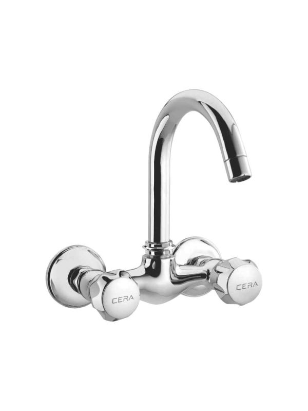 Brand: Cera Series: Ocean Product Name: Half Turn Wall Mounted Sink Mixer with 6.5Inch Long Swivel Spout Sink mixer (wall mounted) with 170 mm (6.5") long swivel spout, connecting legs and wall flanges Item Code: F3001501 Size: 6.5Inch Material: Brass Color: Chrome