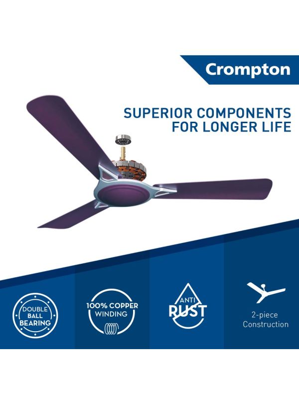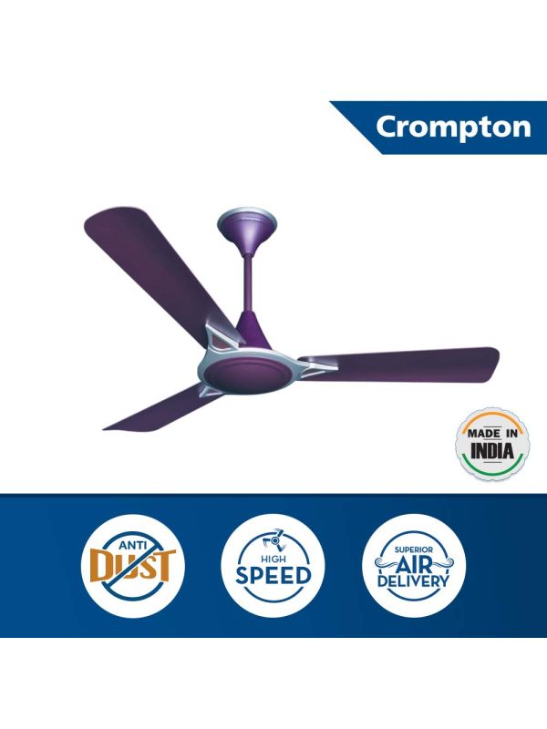 Brand: Crompton Greaves. Series: Avancer Prime. Product Name: Antidust Ceiling Fan. Model Code: AVR-PR-LCMT-12. Warranty: Standard Warranty Applicable Provided By Crompton In India. Size (mm): 1200mm. Size (Inch): 48Inch. Sweep: 1200mm. Power: 77W. Speed: 370rpm. No. Of Blade: 3. Air Delivery: 230 CMM. Country Of Origin: India. Color: Lilac Matt. India 1st Anti-Dust fan.