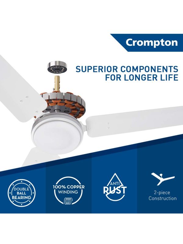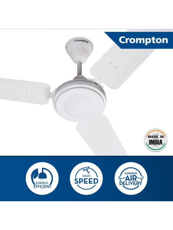 Brand: Crompton Greaves. Series: High Speed Plus. Product Name: Energy Efficient Ceiling Fan. Model Code: HSPL-OPWH. Warranty: 2 Year. Size (mm): 1200mm. Size (Inch): 48Inch. Sweep: 1200mm. Power: 53W. Speed: 370rpm. No. Of Blade: 3. Air Delivery: 218 CMM. Country Of Origin: India. Color: Opal White. Switch on to energy saving mode.