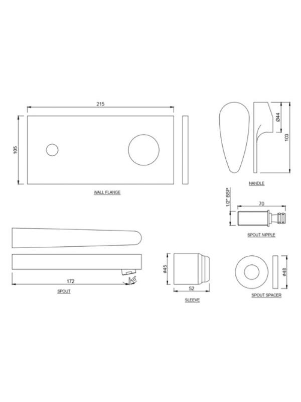 Exposed Part Kit of Single Lever Basin Mixer Wall Mounted Consisting of Operating Lever, Cartridge Sleeve, Wall Flange, Nipple & Spout (Compatible with ALD-233N & ALD-235N)