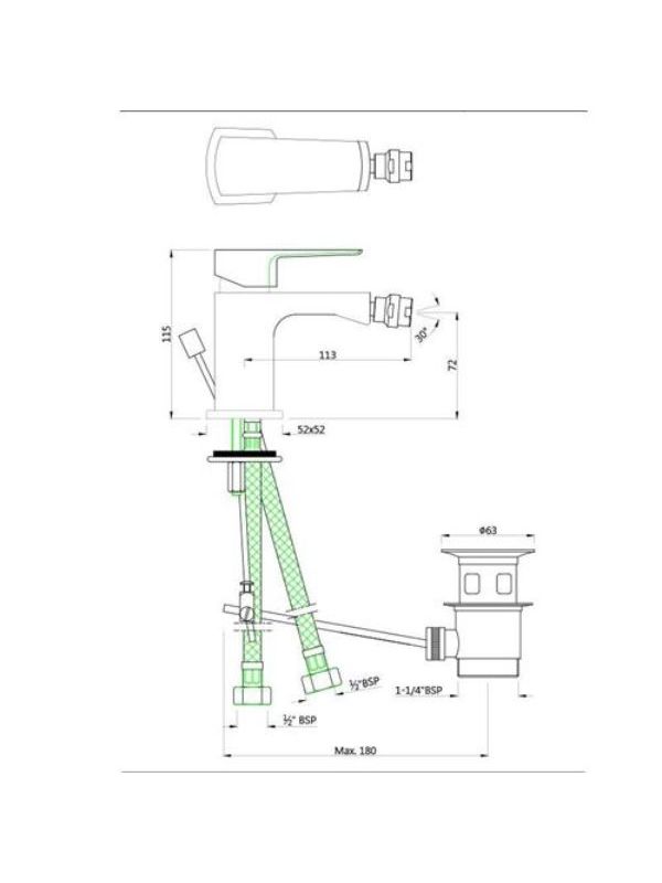 Single Lever 1-Hole Bidet Mixer with Popup Waste System with 375mm Long Braided Hoses
