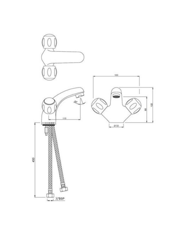 Central Hole Basin Mixer without Popup Waste System with 450mm Long Braided Hoses