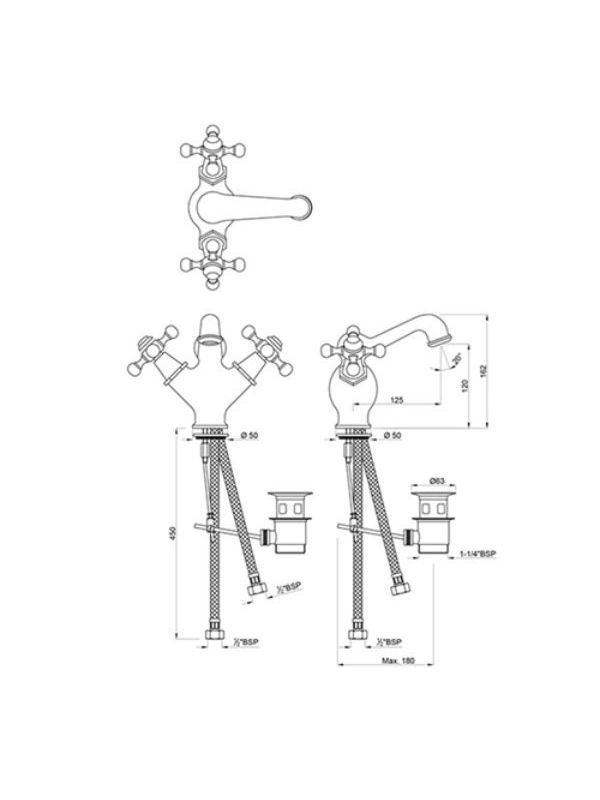 Central Hole Basin Mixer with Regular Spout with Popup Waste System with 450mm Long Braided Hoses