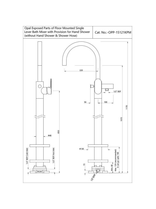 Brand: Jaquar Product Code: OPP-BCH-15121KPM Product Name: Exposed Parts of Floor Mounted Single Lever Bath Mixer Series: Opal Prime Finish: Black Chrome Exposed Parts of Floor Mounted Single Lever Bath Mixer with Provision for Hand Shower, without Hand Shower and Shower Hose (Compatible with ALD-121).