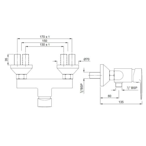 Single Lever Exposed Shower Mixer for Connection to Hand Shower with Connecting Legs and Wall Flanges.