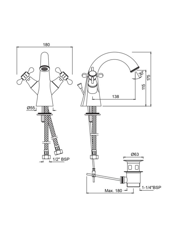 Central Hole Basin Mixer with Popup Waste System with 450mm Long Braided Hoses.