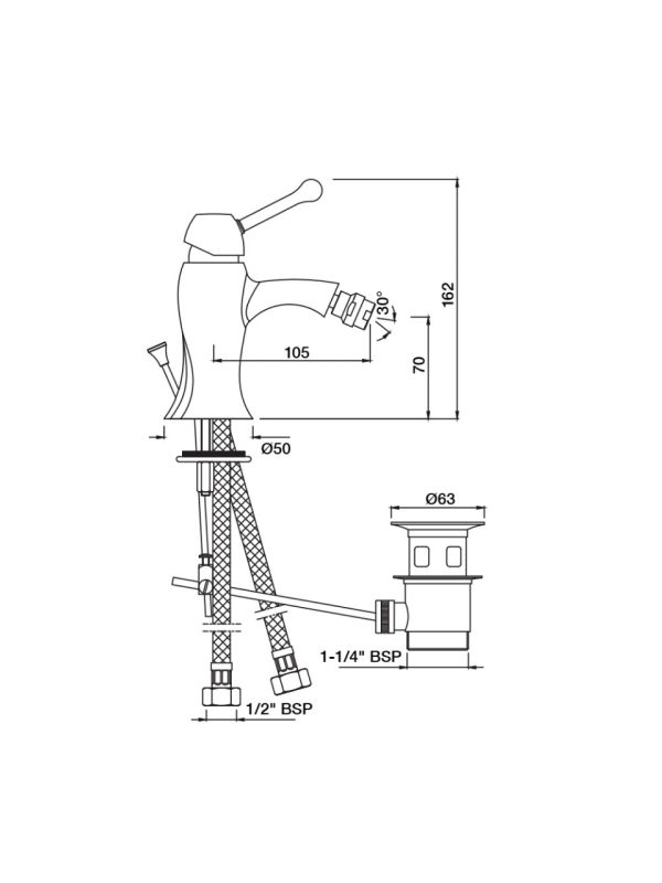 Single Lever 1-Hole Bidet Mixer with Popup Waste System with 375mm Long Braided Hoses.