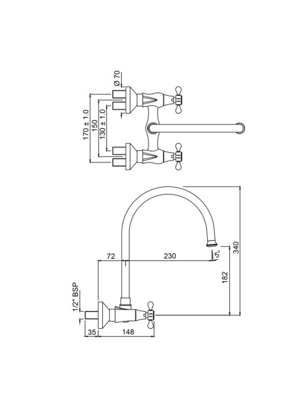 Sink Mixer with Regular Swinging Spout (Wall Mounted Model) with Connecting Legs & Wall Flanges.