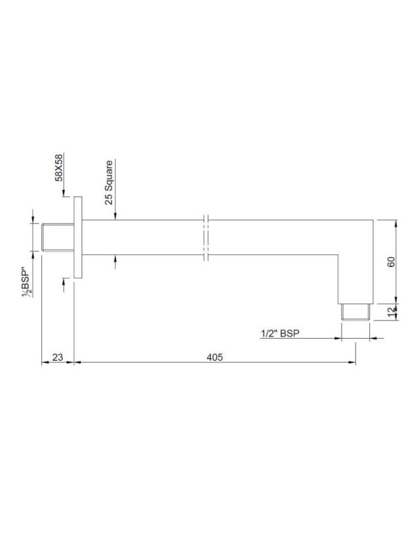 Shower Arm 400x25x25mm Square Shape For Wall Mounted Showers with Flange.