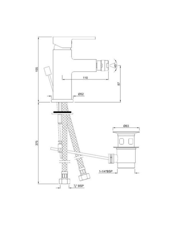 Single Lever 1-Hole Bidet Mixer with Popup Waste System with 300mm Long Braided Hoses