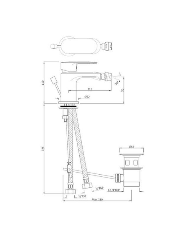 Single Lever 1-Hole Bidet with Popup Waste System with 375mm Long Braided Hoses