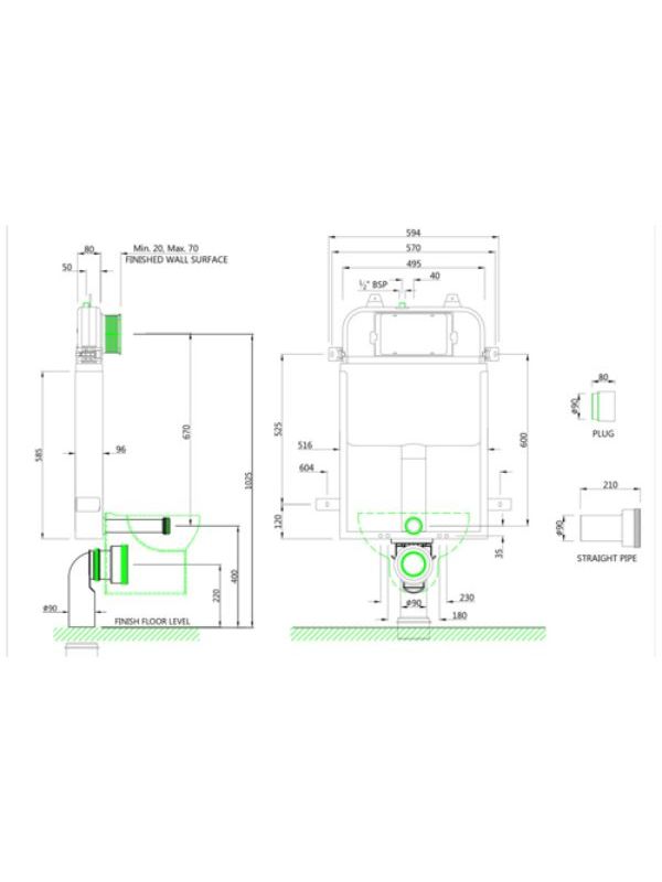 Single Piece Slim Concealed Cistern With Wall Mounting Frame, Installation Kit And "S-Type" Drain Pipe Connection Set For Wall Hung Wc (Without Flush Control Plate)