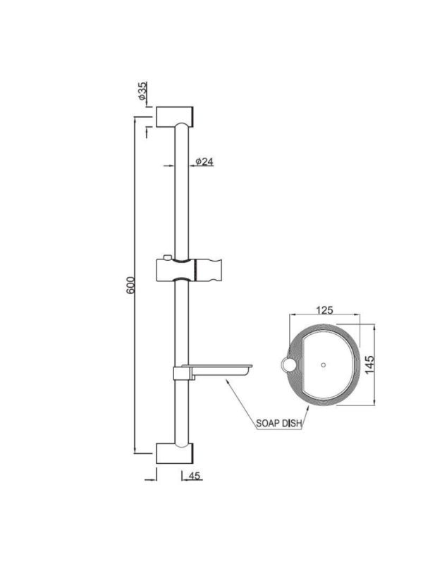 Sliding Rail Dia 24mm and 600mm Long Round Shape with Hand Shower Holder and Soap Dish.